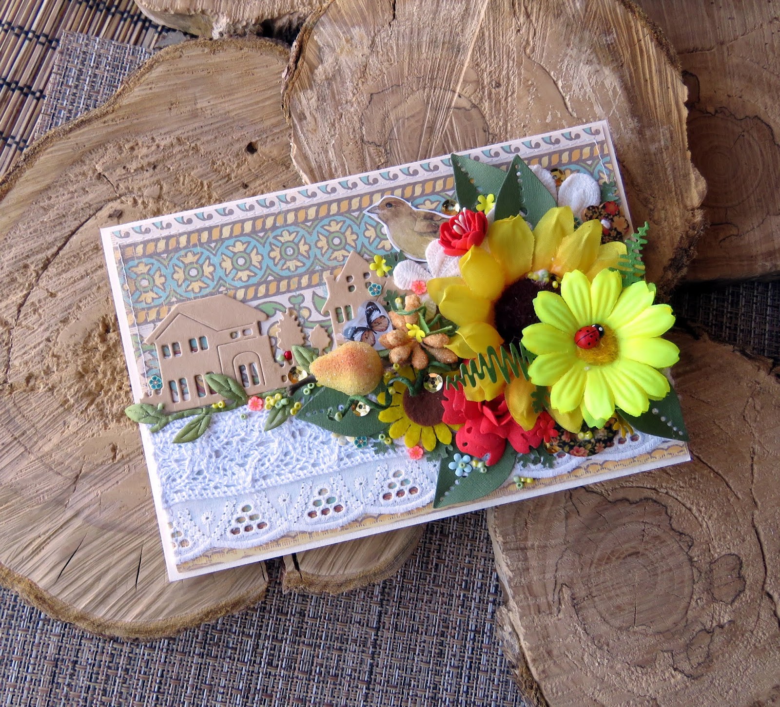 Мне заказали открытку на юбилей любительнице подсолнухов и загородной жизни. Вот такая летня получилась: